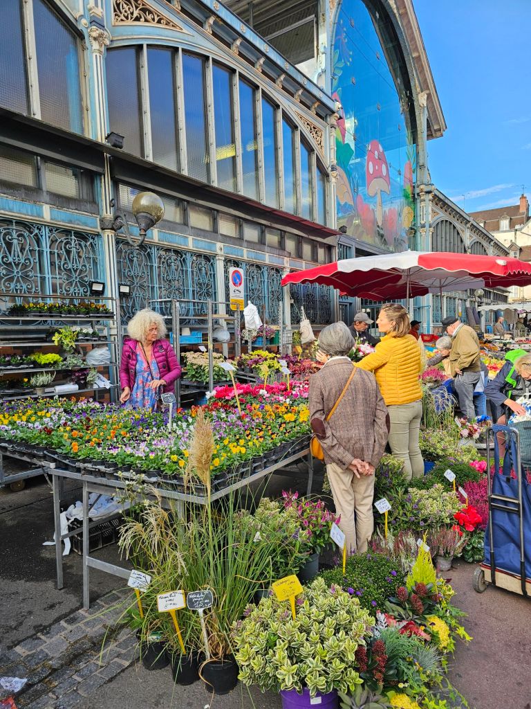While many markets in larger European cities are full of tourists and tour groups, this one was not. We were one of the few tourists in the market and stuck out a bit. While the shoppers differed from many other Europe markets, the market itself was visually very similar. Colorful kiosks offered fresh cut flowers, potted plants, an endless array of fresh fruit and vegetables, and some rather pungent seafood and meats. The space was large, with high wooden ceilings, glass skylights, and robin’s egg blue metal beams.